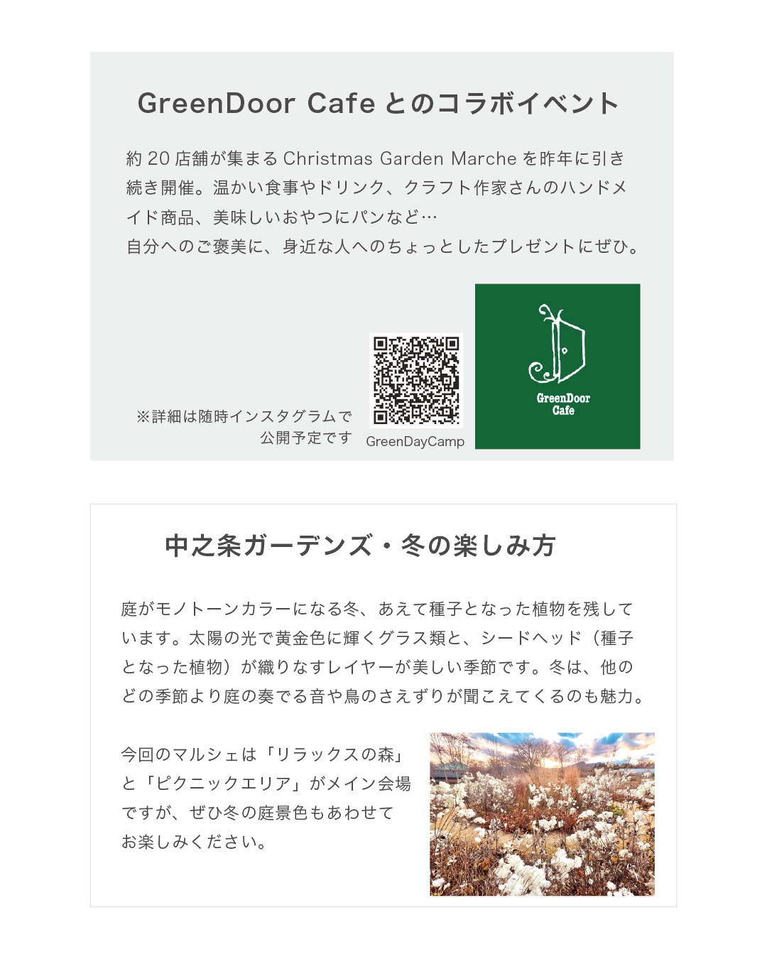 | 入場料 | 300円(中学生以下無料) ※入園料は無料ですが、クリスマスマルシェ会場には入場料300円が必要です。 ※中之条町民は入場無料 |