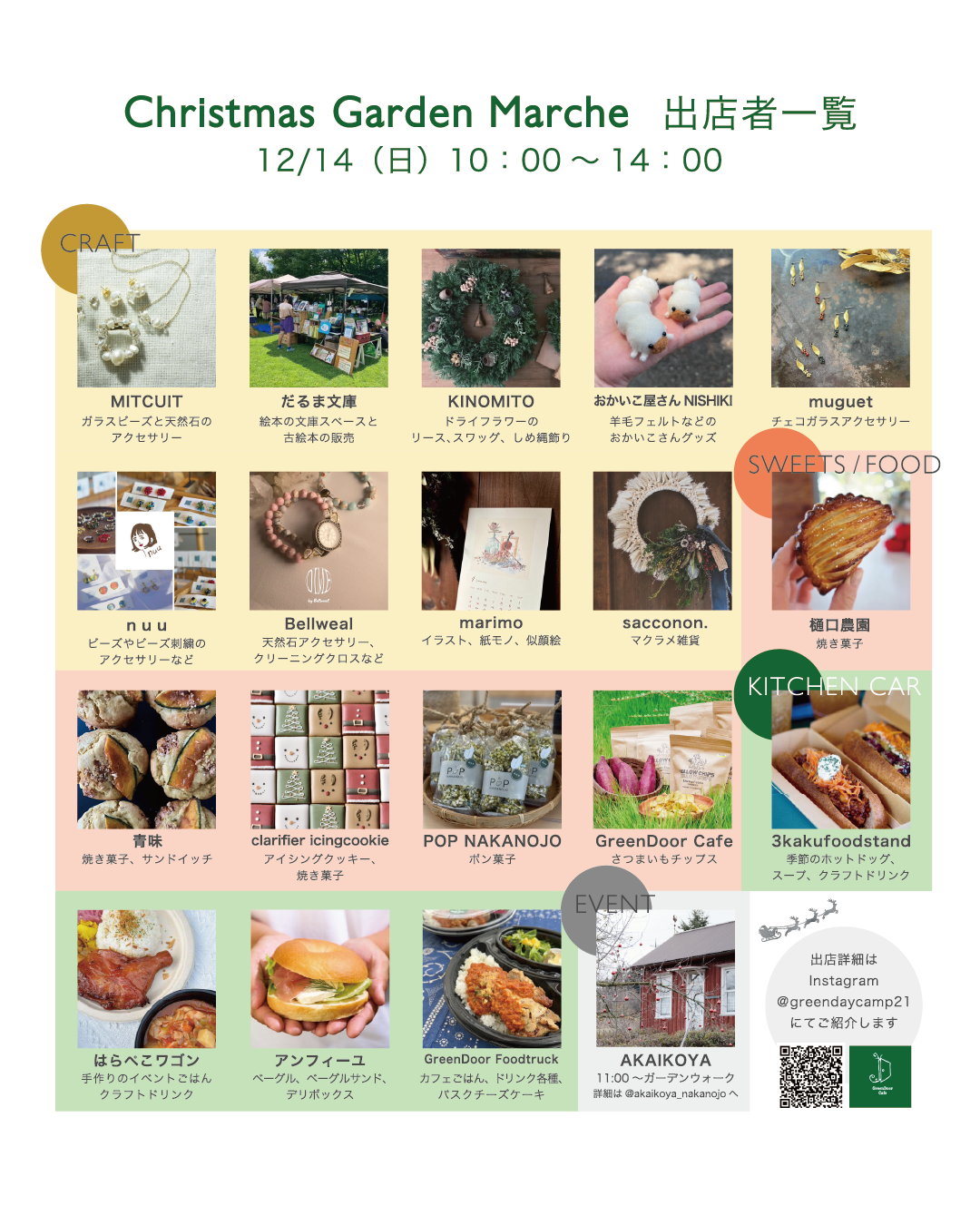 食事やお菓子、雑貨やアクセサリーなどを販売します。会場もクリスマス仕様になりますのでぜひお越しください。