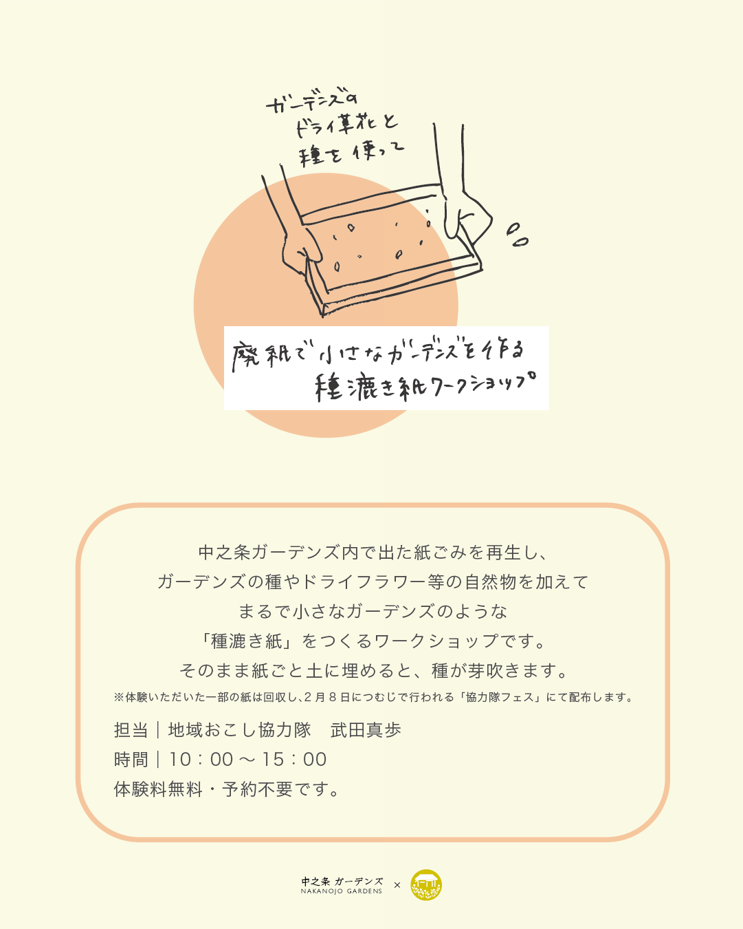 ※種漉き紙は一部を回収して2/8につむじで行われる「協力隊フェス」にて配布いたします。ガーデンズの魅力が種となって広がるように、ご協力をお願いいたします。