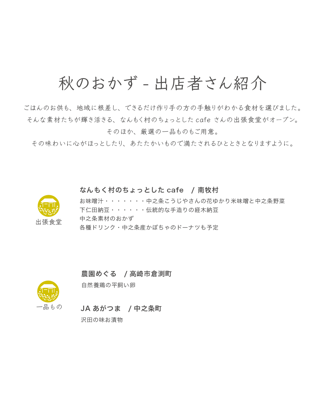 出店者さんが販売する、中之条や群馬食材の「秋のおかず」をごはんのお供にどうぞ。