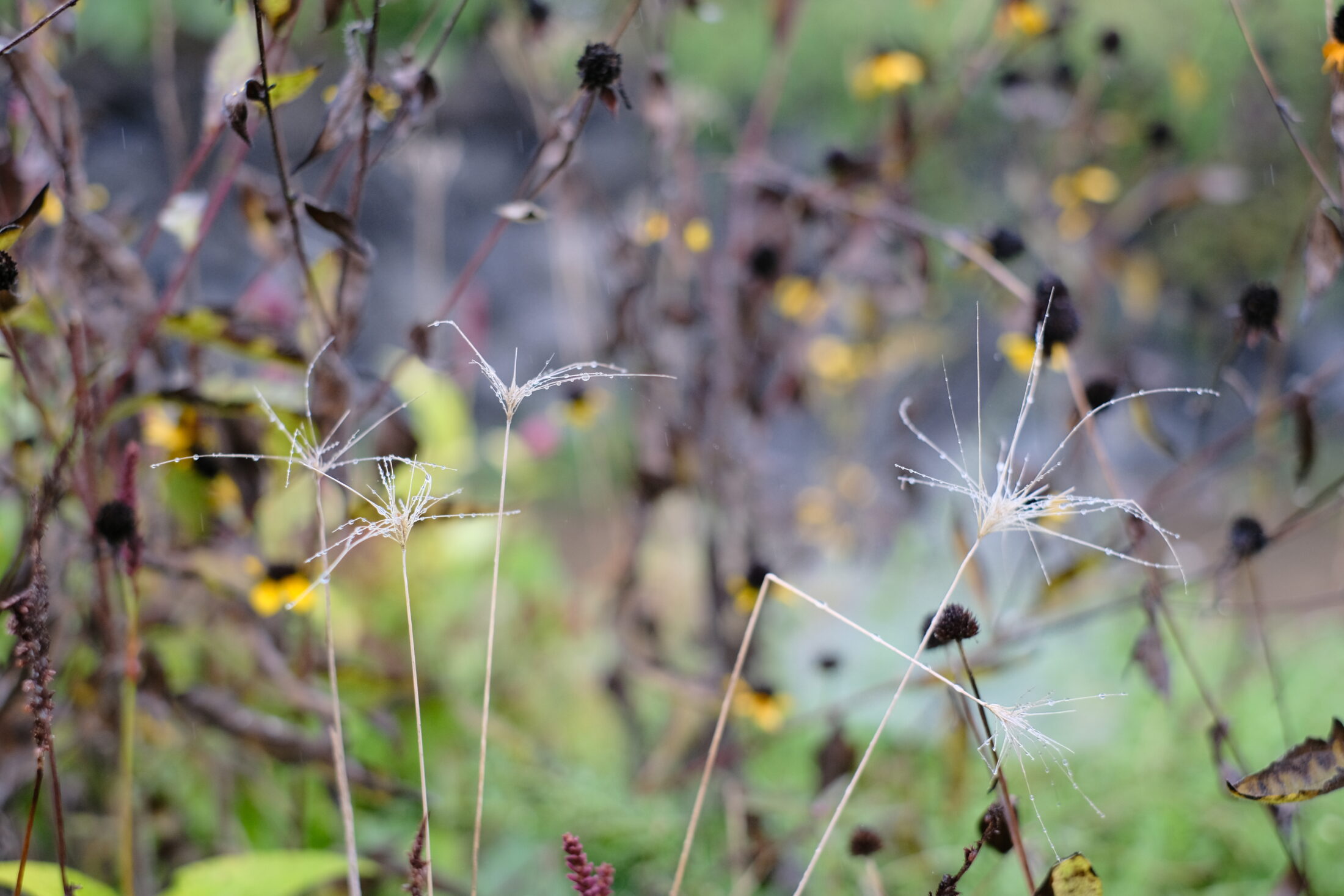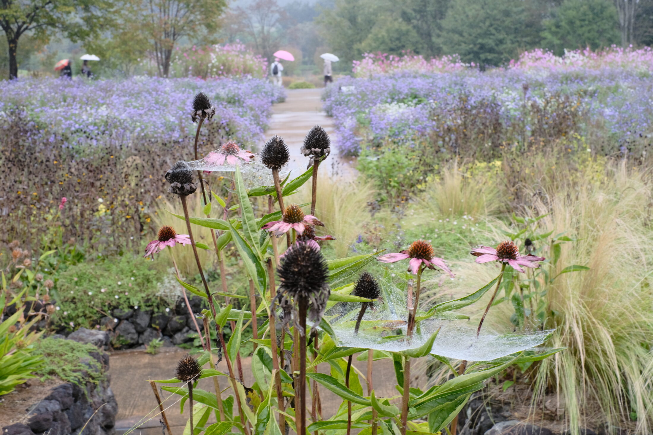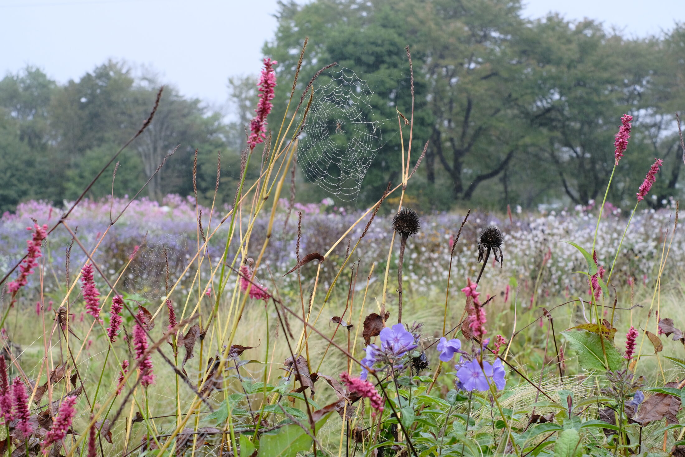 スパイラルガーデンのシードヘッドに張られたクモの巣が繊細で見飽きないです。