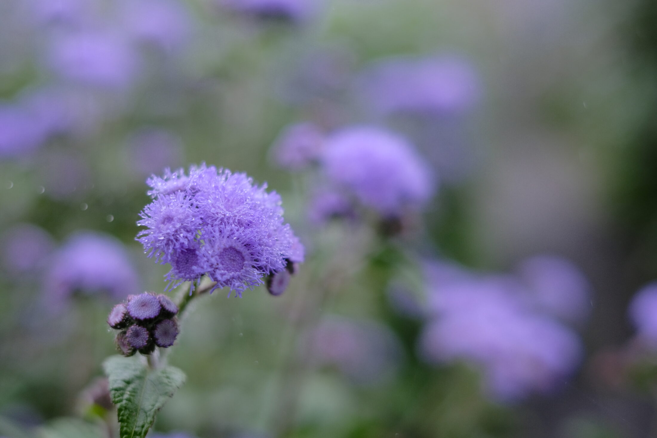 スパイラルフィールドのアゲラタムは変わらず鮮やか。近寄ると雨粒で宝石のような輝きです。