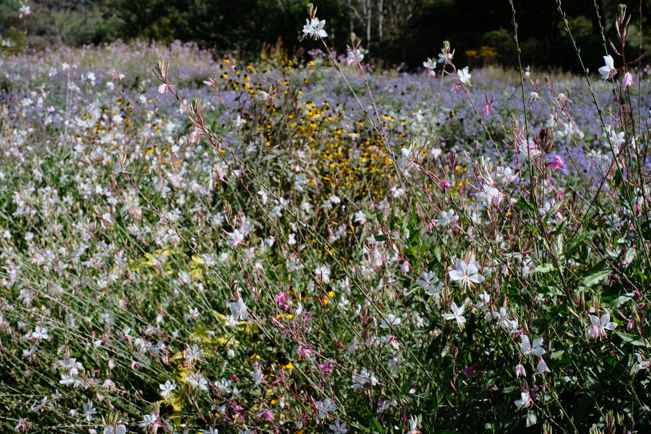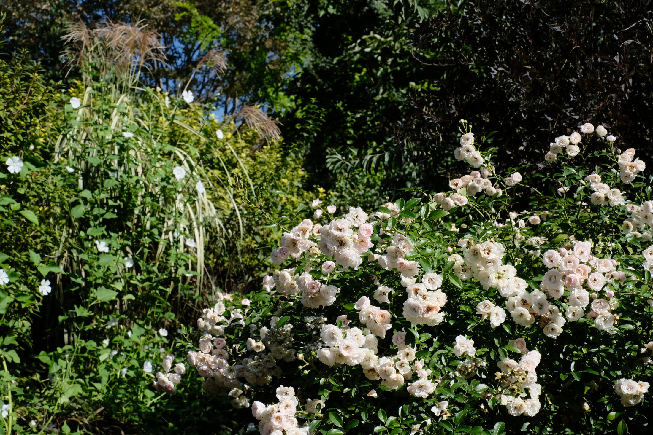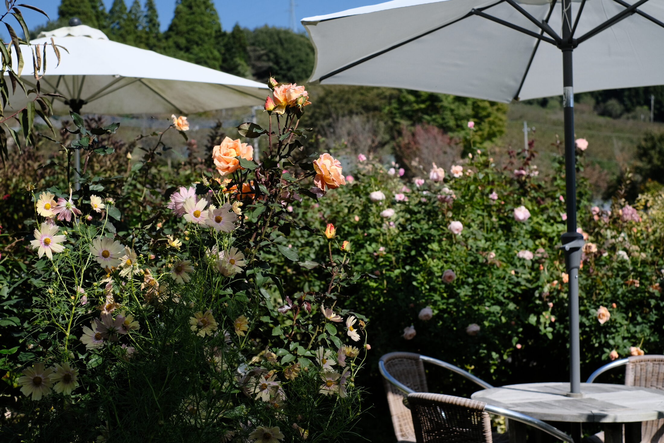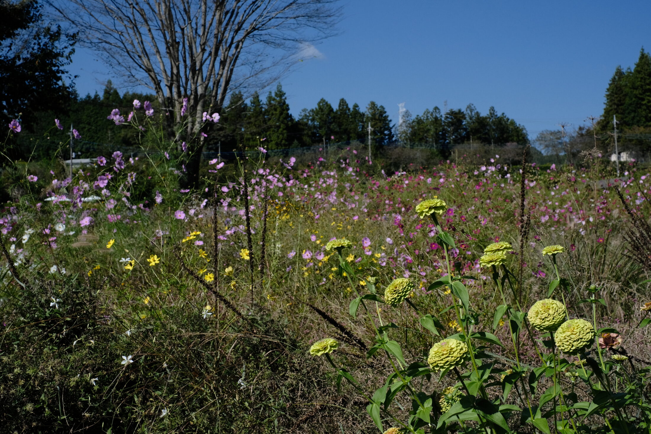 メドウパスではコスモスが華やかです。ダリアやジニア、シードヘッドやグラス、そして自生する雑草たちのバランスが心地よい場所です。