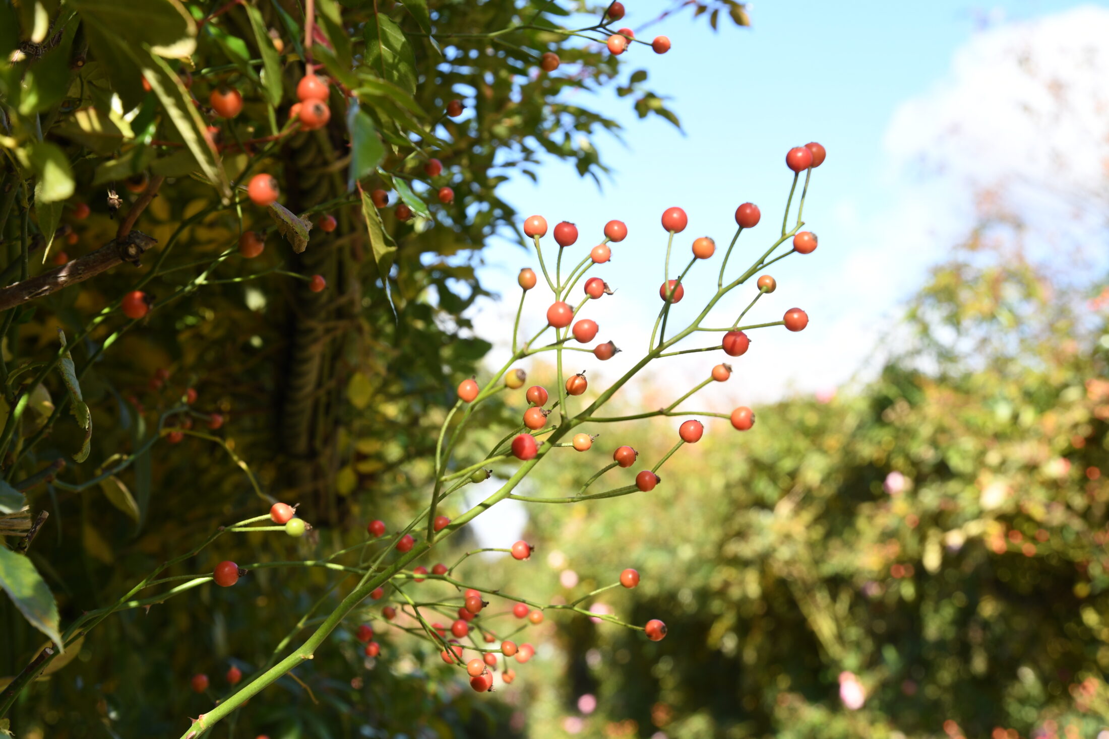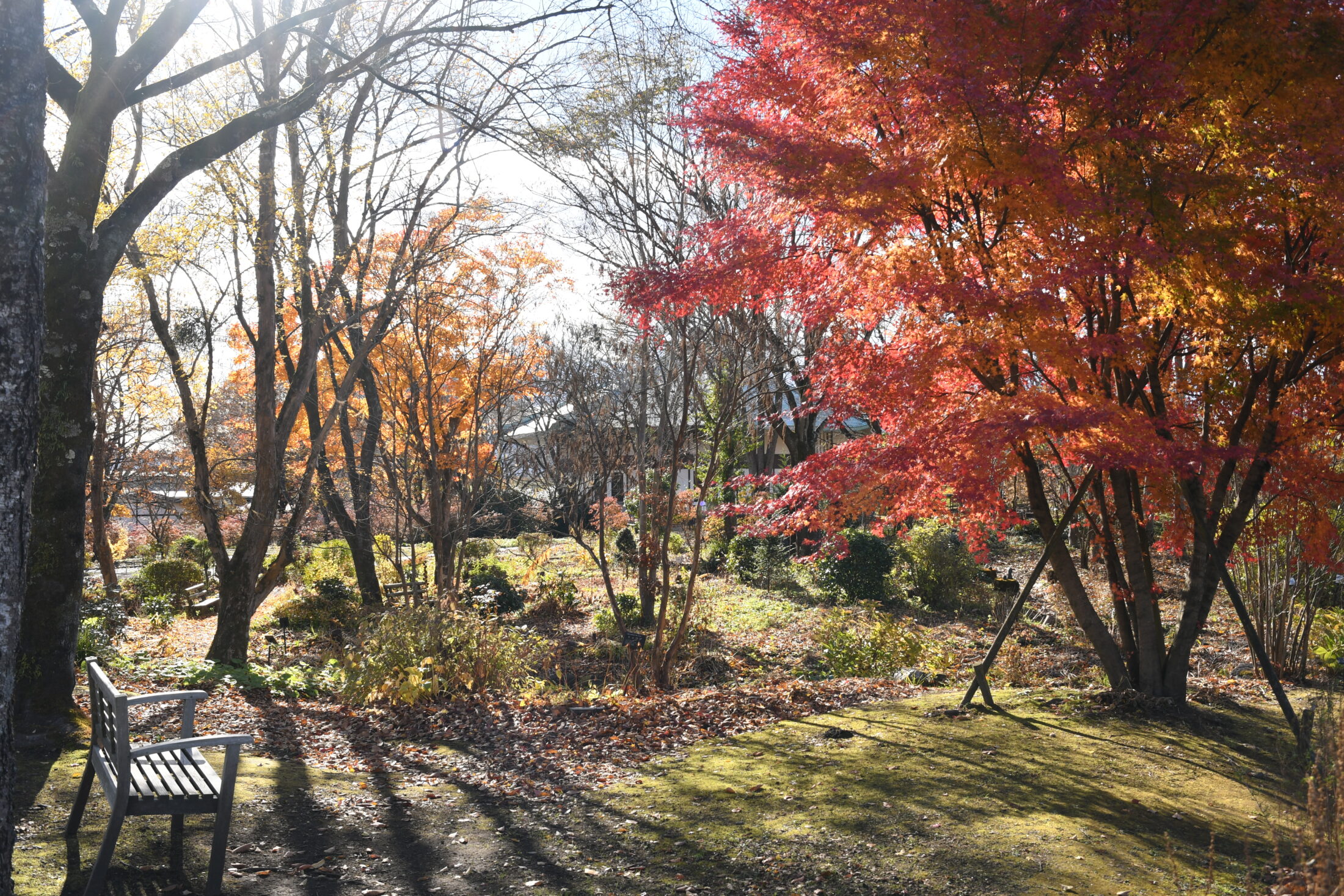 現在の庭は紅葉が見ごろで、ナチュラルガーデンやスパイラルガーデンのシードヘッドとあわせて秋の庭を感じられます。
