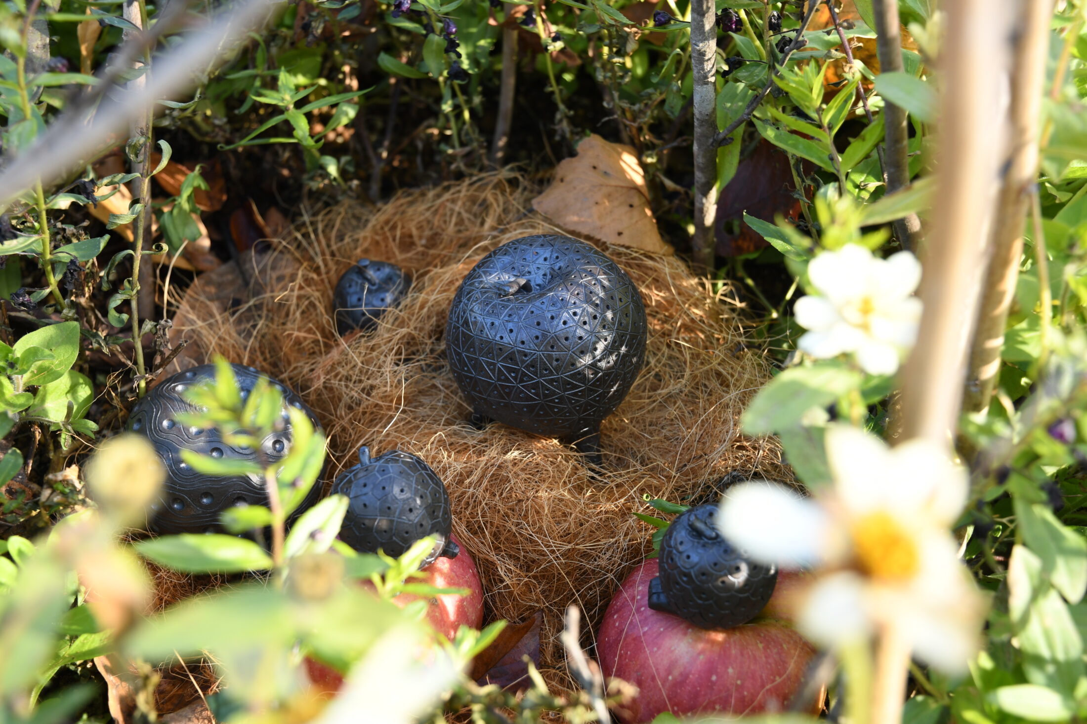 赤い小屋前にある浅野さんとのコラボディスプレイです。りんごのトリックスターをりんご畑の収穫祭に合わせて作ってくださいました。ショップでトリックスターの販売もしています。