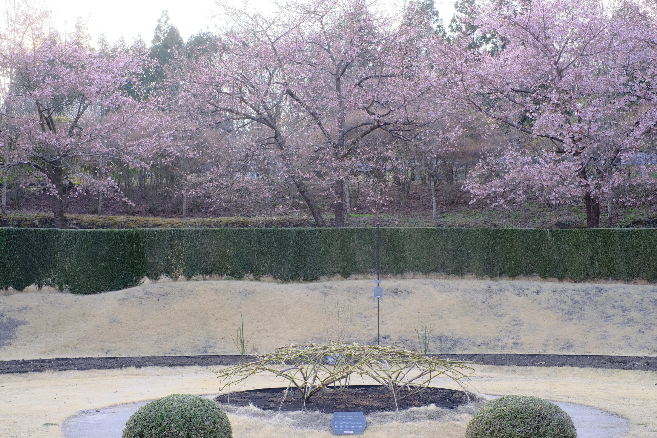 町民花壇横のオオカンザクラは約半分の開花。花みどり館横のソメイヨシノはまだつぼみです。