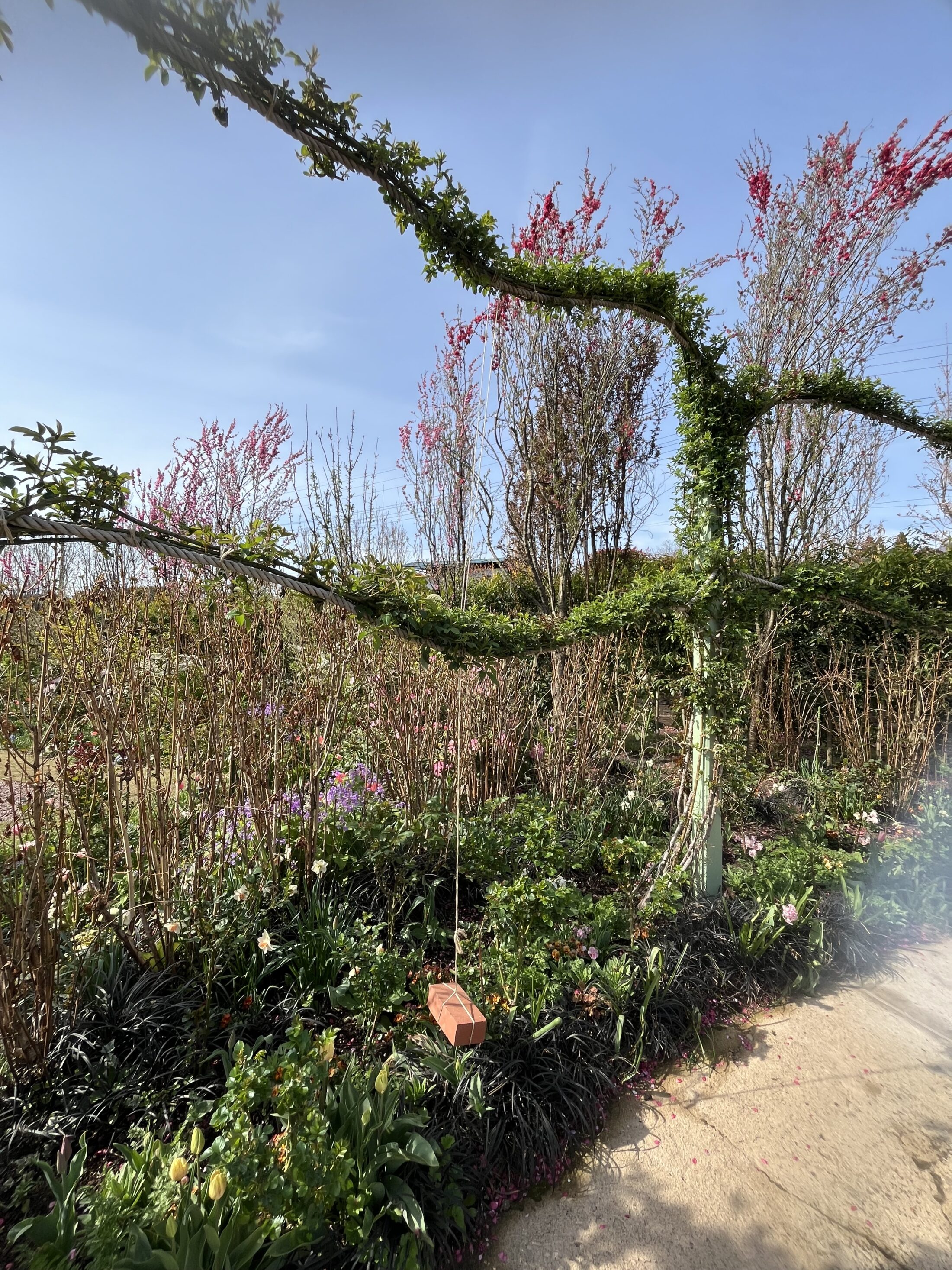 現在は新芽が出始めたバラのガーランドに、レンガの重みで美しくやわらかな曲線を形作っているところです。