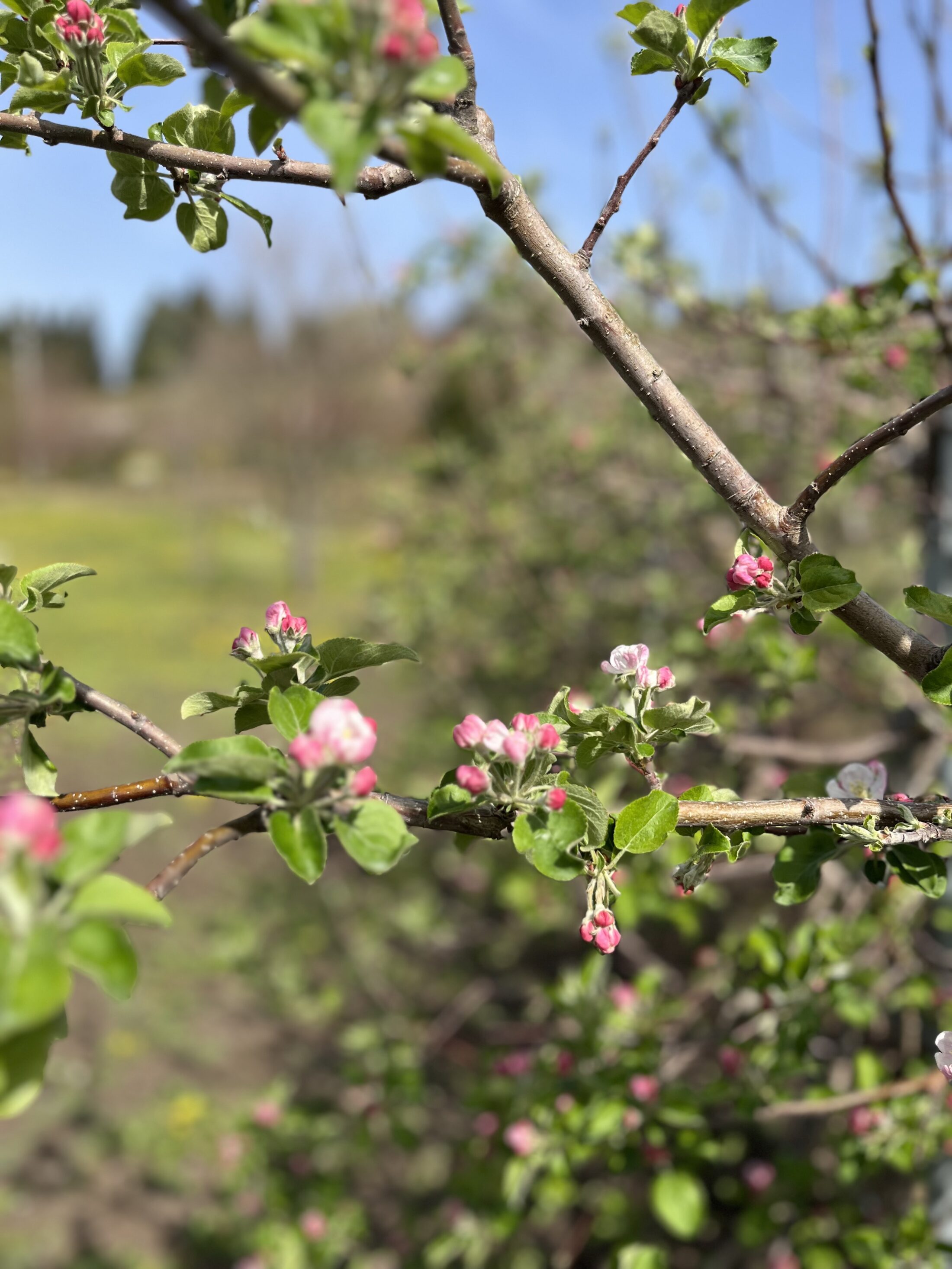 赤い小屋の前のりんごの木に可愛い花が咲き始めました。