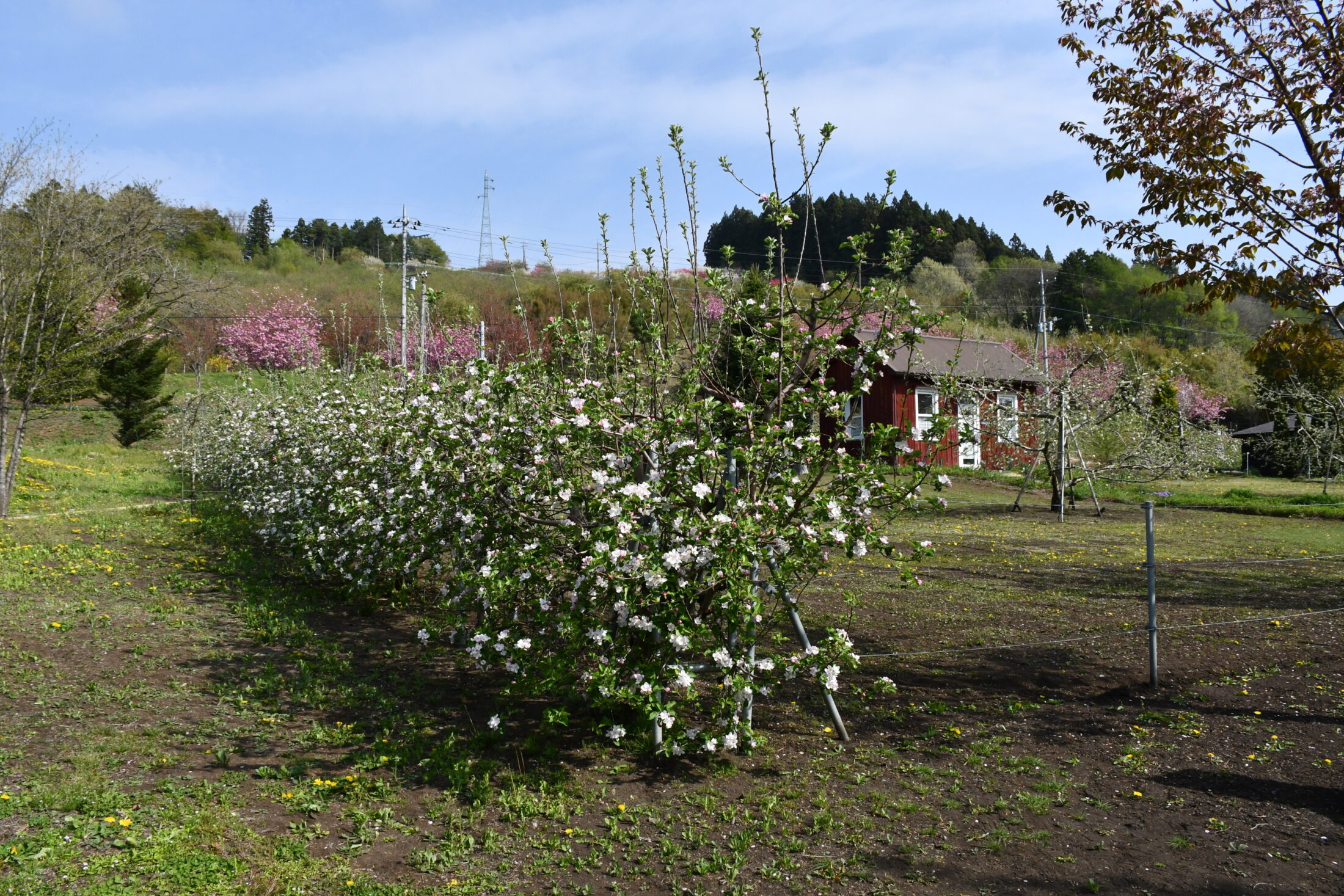 赤い小屋の周りのリンゴの花もどんどん咲いてきて、とてもかわいいです。