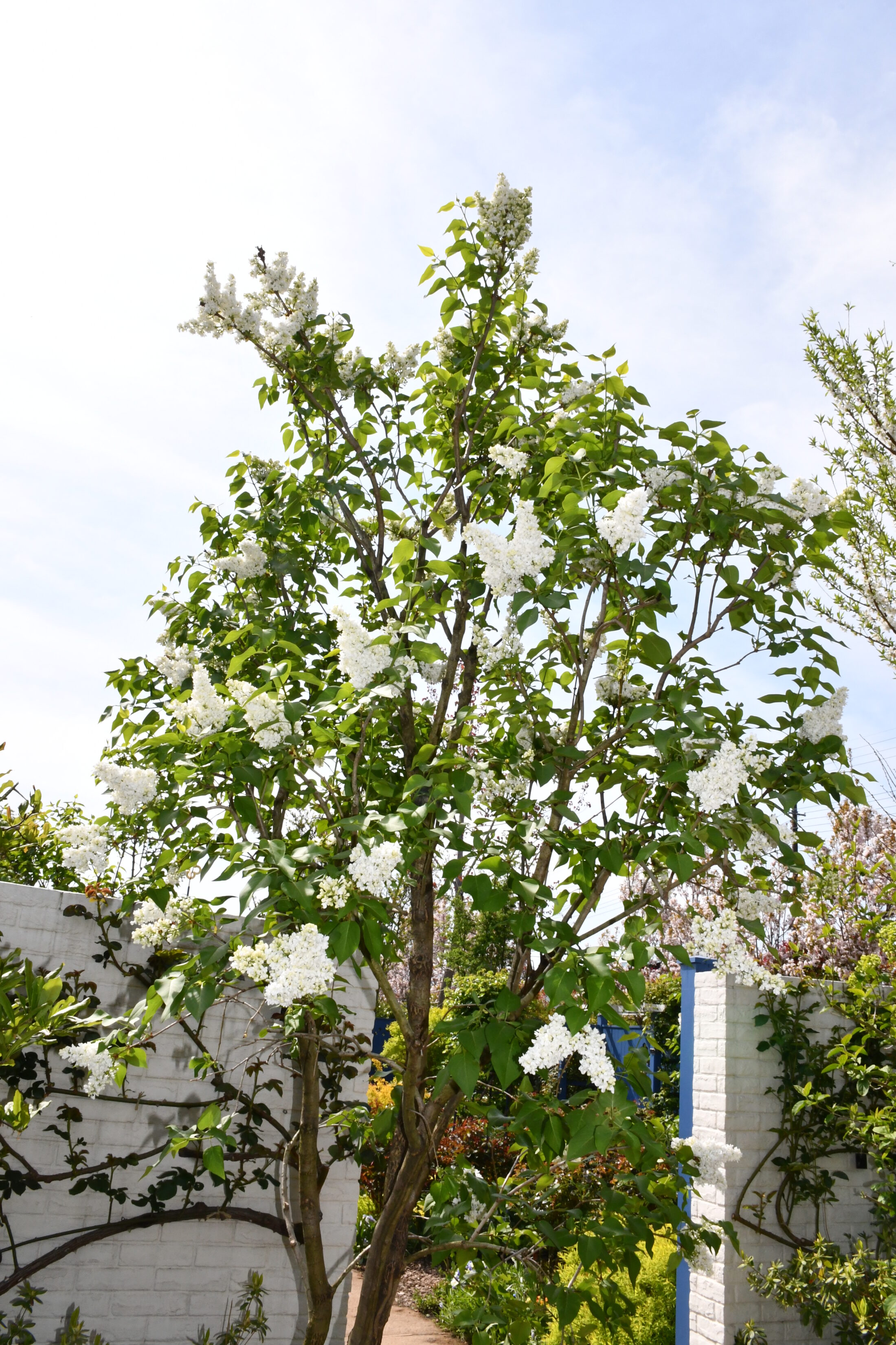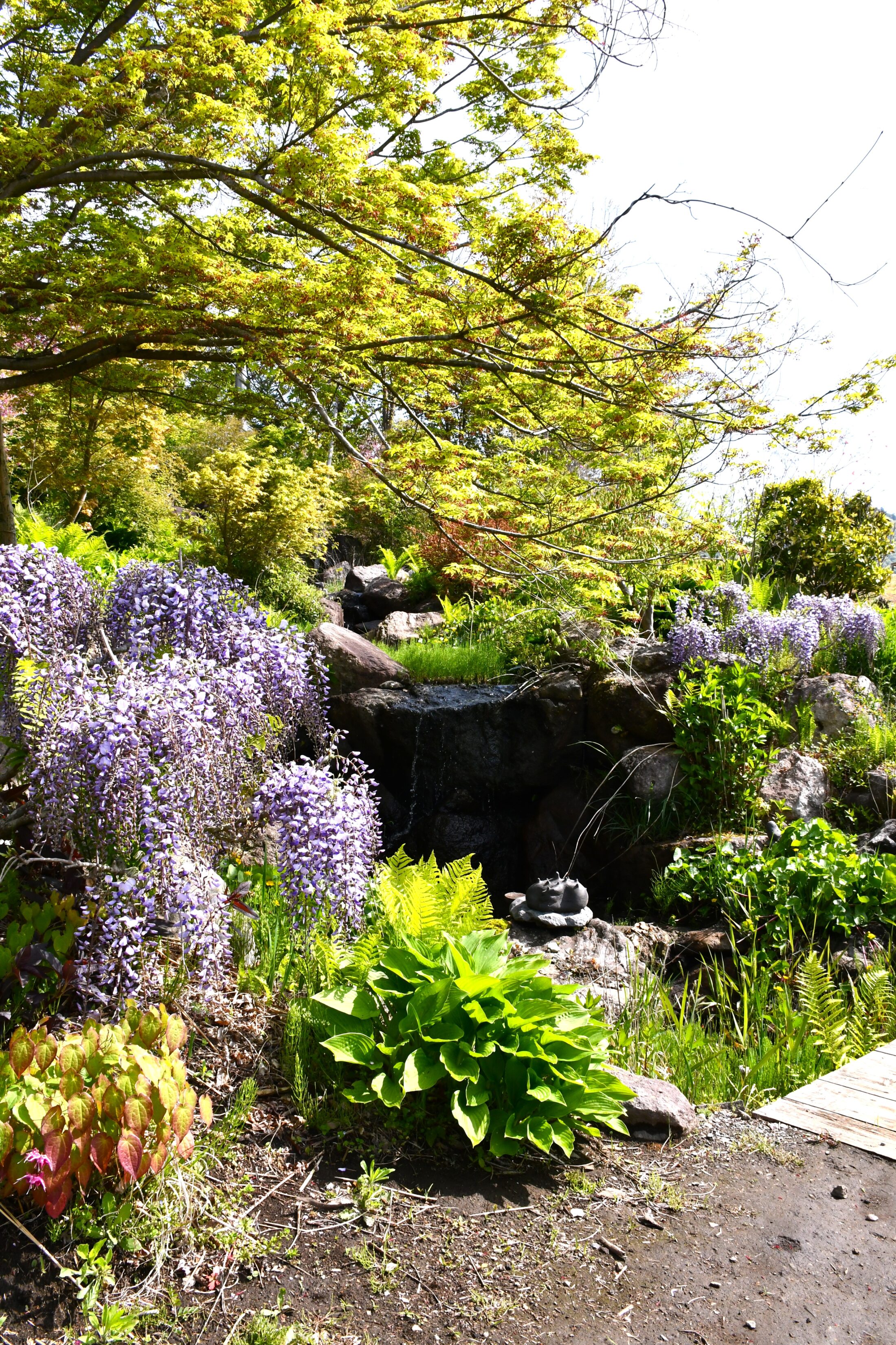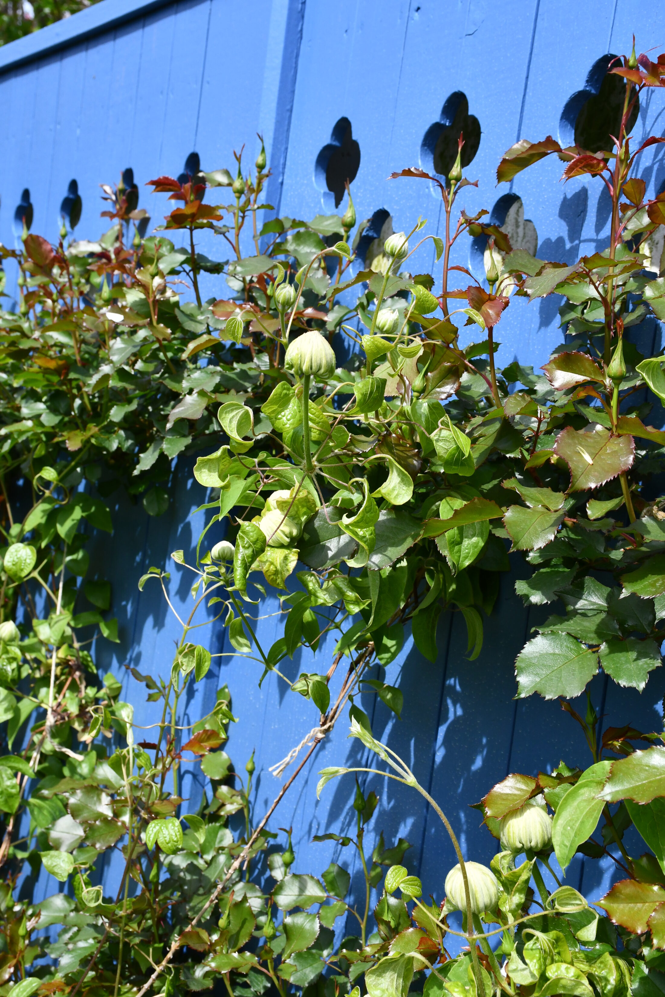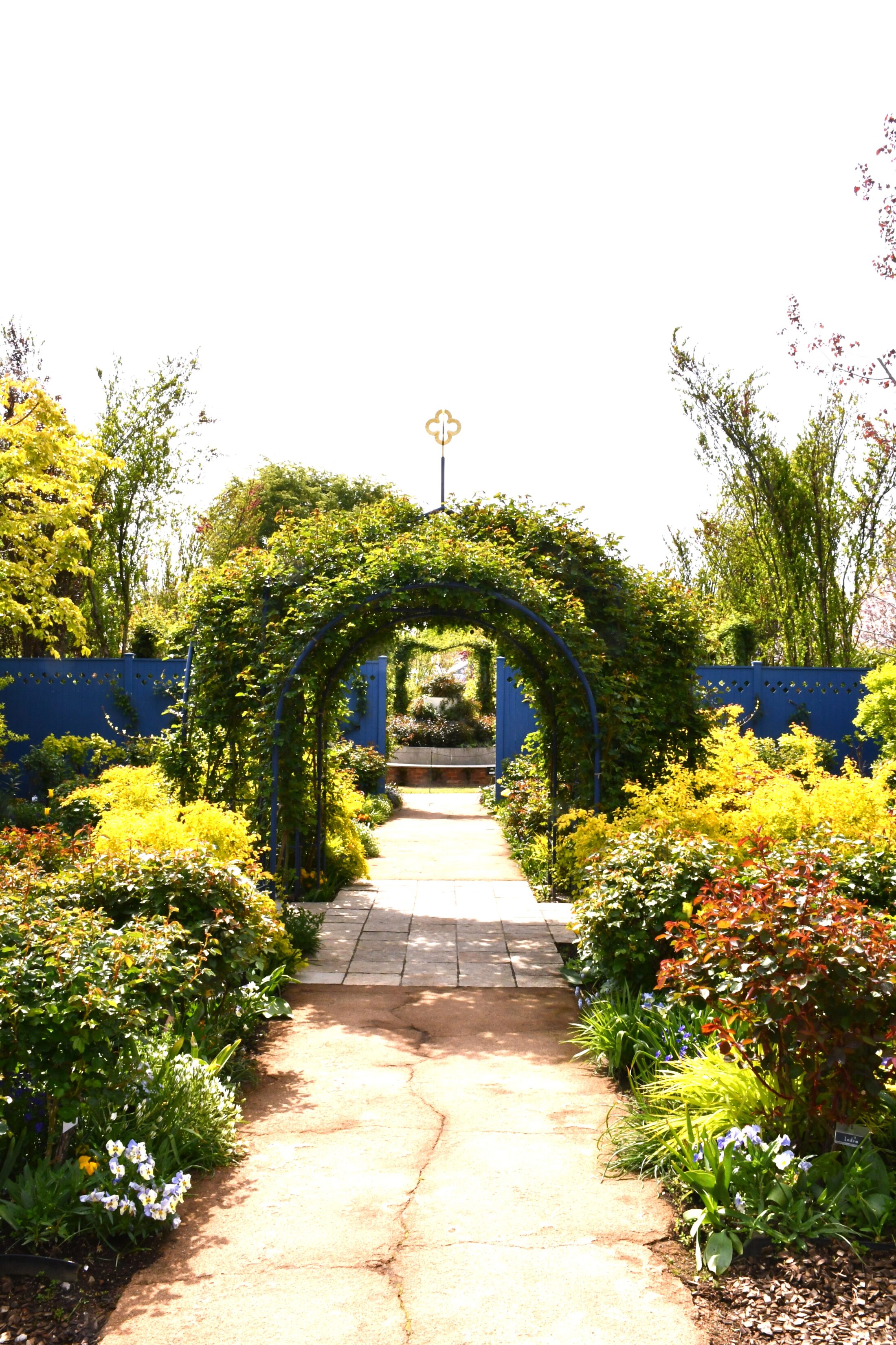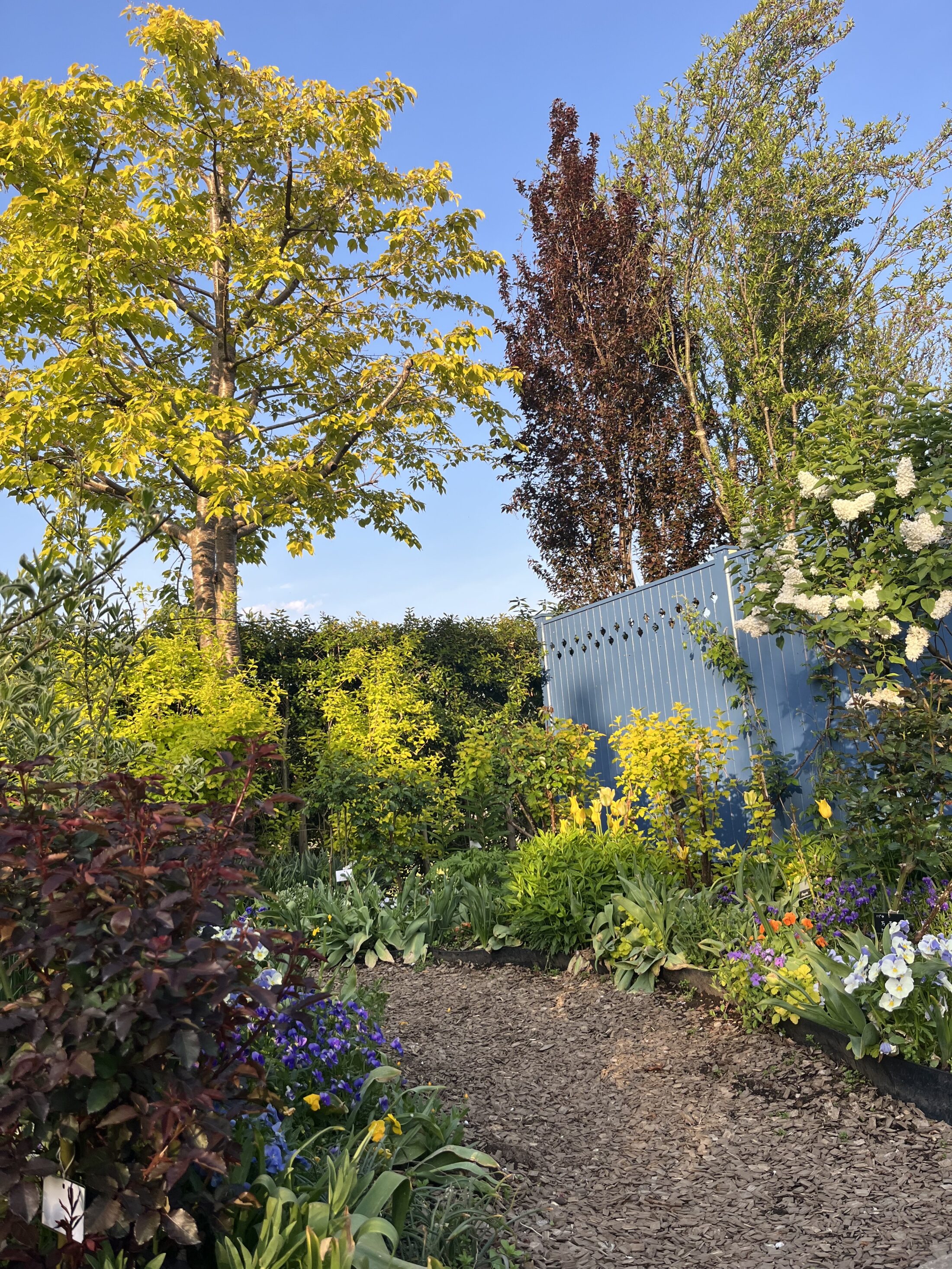 バラの開花はまだですが、木々や草花のグリーンやえんじ色、オーレア色のリーフカラーが、イエローガーデンを囲む壁のブルーにとても映えます。