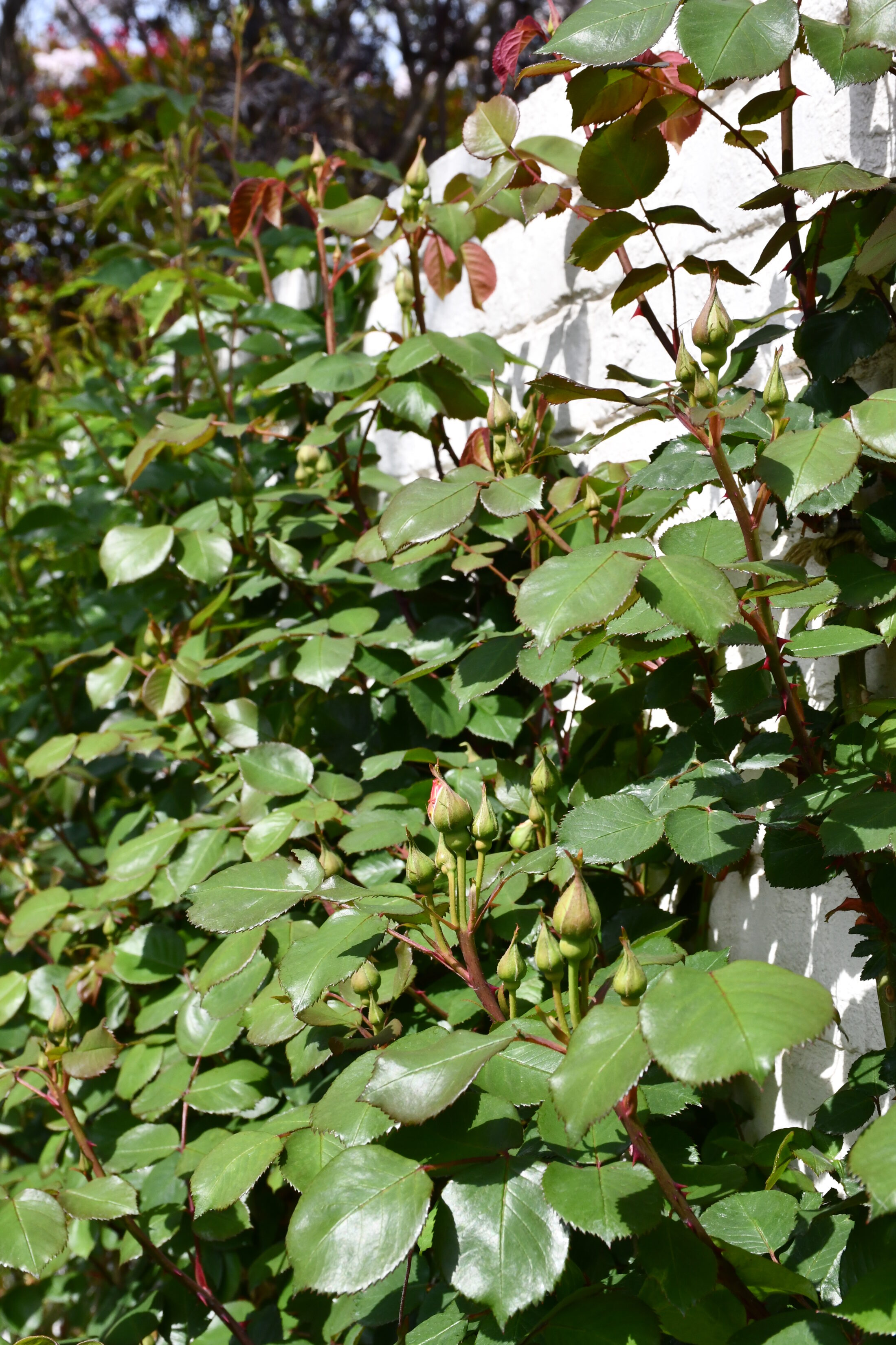 毎年早めに咲くバラ「サハラ’98」やクレマチスに膨らんだつぼみを見つけました。