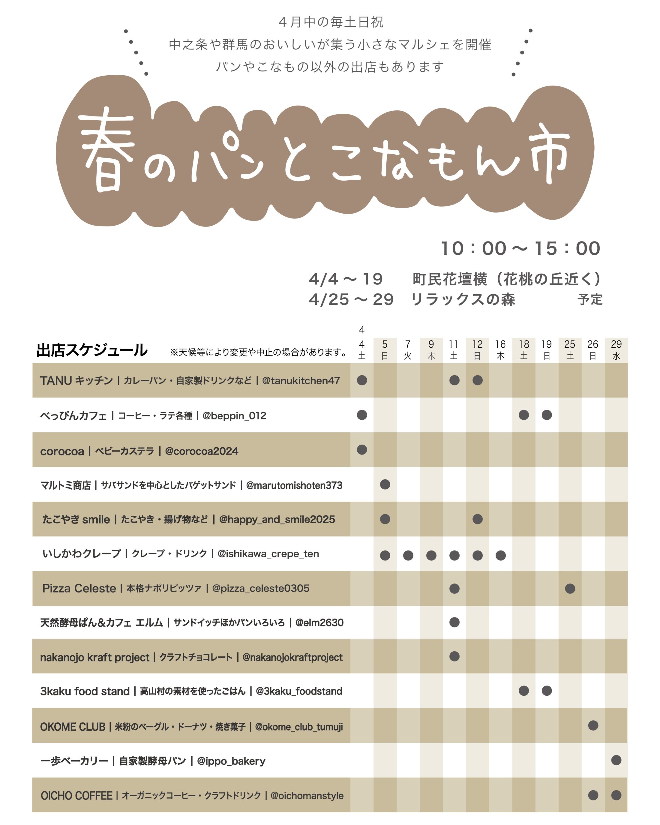 4月は毎土日祝、パンやこなもの系の出店が集う小さなマルシェを開催します。 一部平日の出店もあります。 …